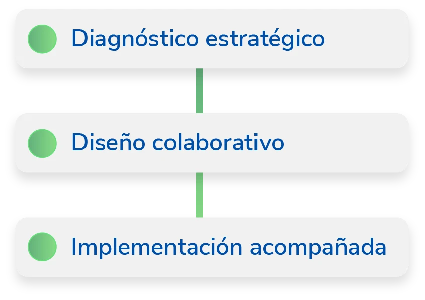Nos integramos como una extensión de tu equipo: diagnosticamos con precisión, diseñamos juntos soluciones viables y te acompañamos en cada paso de la implementación.